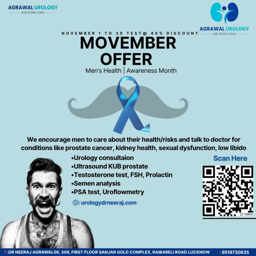 Prioritize your health this Movember with Agrawal Urology’s special 40% discount on men’s health tests. Early screening saves lives—check prostate, hormones, kidney, and sexual wellness. Book your consultation now and take control of your wellbeing. Let’s raise awareness and promote a healthier future for all men.
